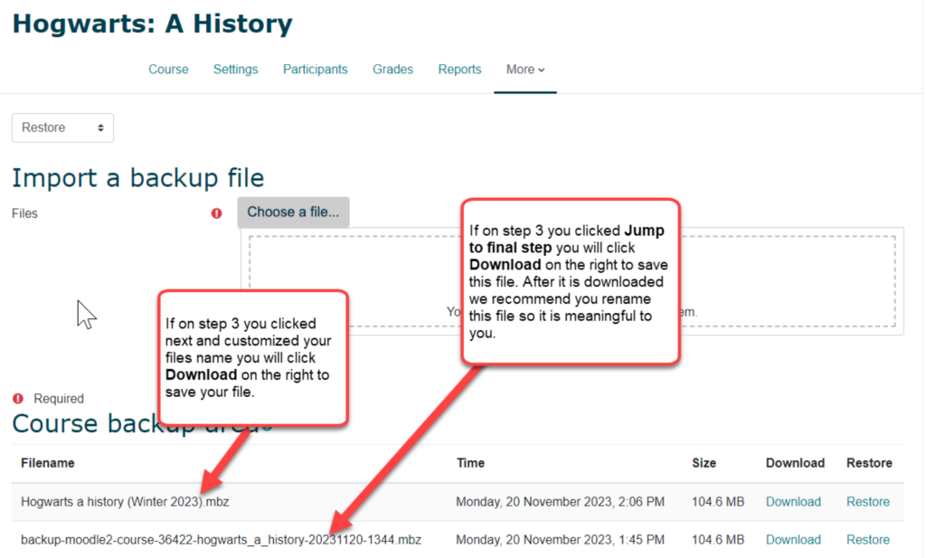 - You will be taken to the course restore screen which holds the Course back up area. Here, you will download your backup file.