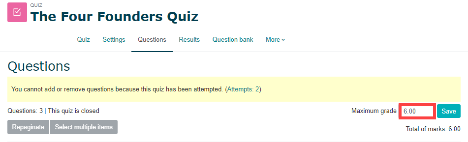 Click on the quiz, then select Questions. Now to adjust the maximum grade. Enter the new maximum grade in the Maximum grade field and select Save to the right of it. To apply the changes you will need to regrade all attempts.