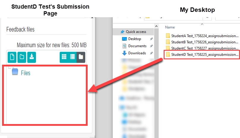 - Drag the marked essay of that student to their submission. You will drag it to the feedback files section.