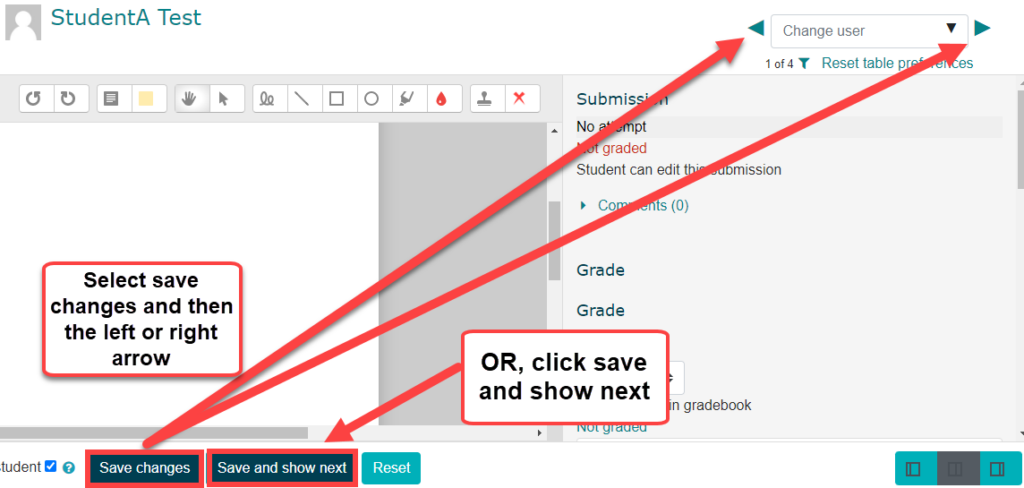 - Then select Save changes, followed by the blue left or right arrow in the top right corner of the page to move to the previous or next student to mark OR click Save and show next to bring you to the next student to mark.