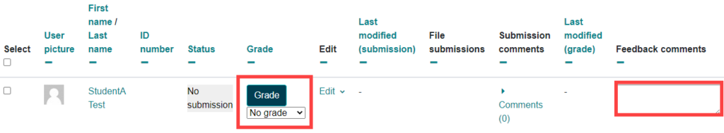 - Scroll back up to the top of the page. Now you can view each student assignment here and under the grade column for each student, select the dropdown to choose the grade you would like for each of them or type in a score. You can also add feedback here in the feedback comments column.
