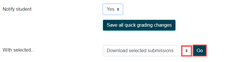 - Select all individuals/students, by checking off the box next to select. Then scroll down near the bottom of the page and choose download selected submissions from the drop-down and hit go.
