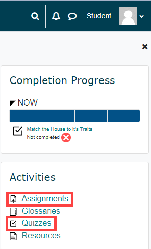 You can also access a list of the course assignments from the Activities Block located in the collapsible block drawer