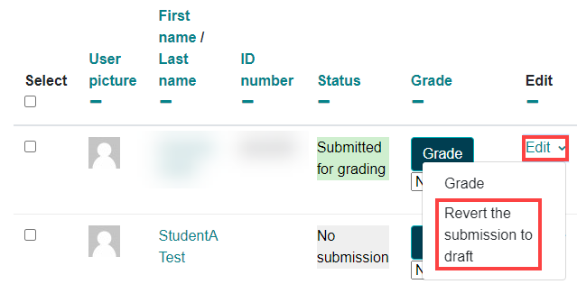 To revert a submission to draft, click on the assignment title in blue and select view all submissions. Then, find this student’s name and click on the blue edit next to their grade and select revert the submission to draft.