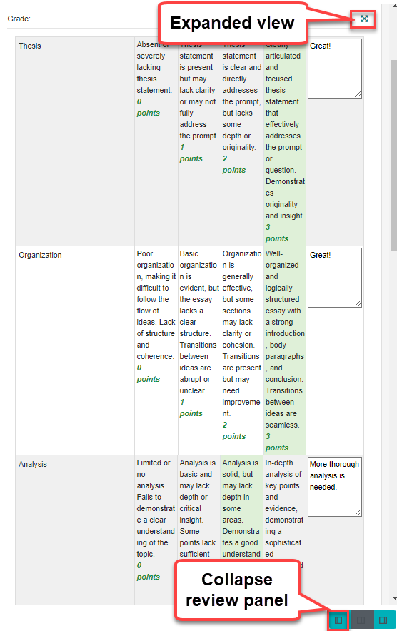 - Your rubric will display as a table on the right-hand side of the screen. You can make it larger by collapsing the review panel or by selecting the expand icon.