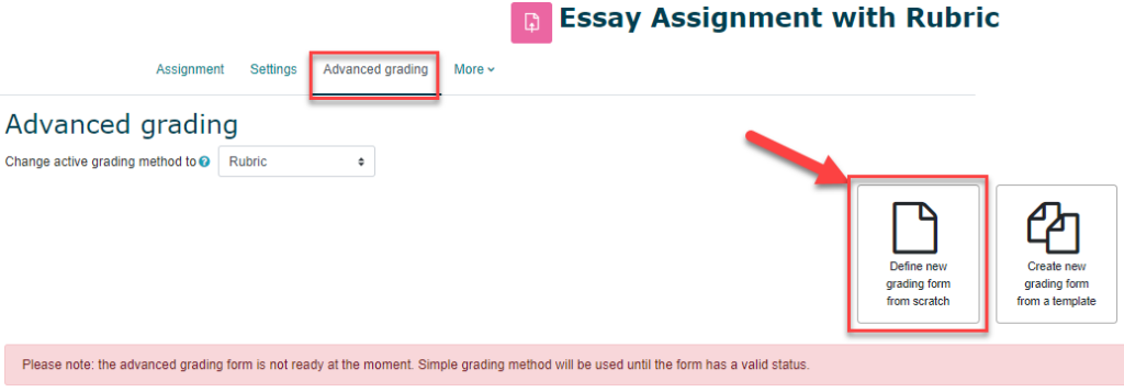 After saving your settings, you will be brought to the Advanced Grading tab in your Assignment Activity. Note that the advanced grading form is not yet ready, and simple grading method will be used until the form has a valid status. You can return to this tab at any time.