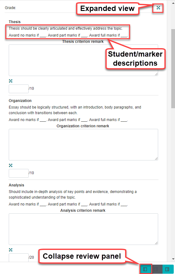 - Your marking guide will display as a table on the right-hand side of the screen. You can make it larger by collapsing the review panel or by selecting the expand icon.