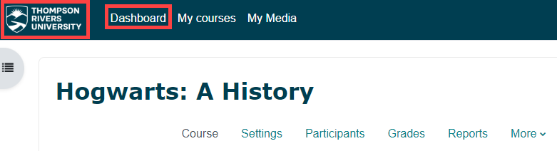 If you go into a class there are a few ways to get back to the Moodle Dashboard: The TRU Moodle icon, the TRU crest, the Navigation drawer, in a course breadcrumb trail and in the user menu at the top right of the page next to your name.