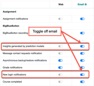 Most commonly we are asked how to turn off Insights (an email identifying at risk students based on course start and end dates) and new login notifications which are highlighted below.
