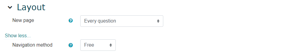 New page: For longer quizzes it makes sense to stretch the quiz over several pages by limiting the number of questions per page. When adding questions to the quiz, page breaks will automatically be inserted according to the setting you choose here. However, you will also be able to move page breaks around by hand later on the editing page. We do not recommend the option Never, all questions on one page as the quiz saves when the students click the Next button.