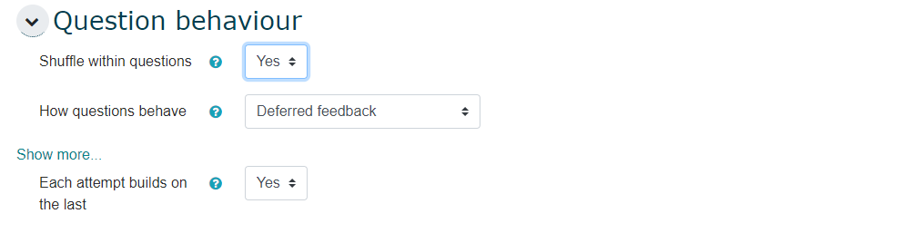 How questions behave: Students can interact with the questions in the quiz in various different ways. For example, you may wish the students to enter an answer to each question and then submit the entire quiz, before anything is graded or they get any feedback. That would be ‘Deferred feedback’ mode (most commonly used). Alternatively, you may wish for students to submit each question as they go along to get immediate feedback, and if they do not get it right immediately, have another try for fewer marks. That would be ‘Interactive with multiple tries’ mode.