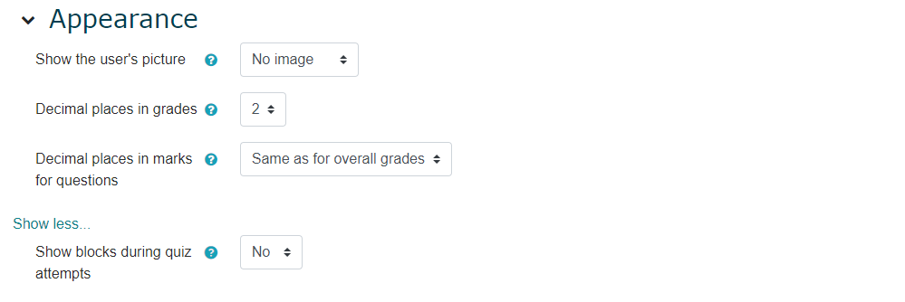 Decimal places in question grades: This setting specifies the number of digits shown after the decimal point when displaying the grades for individual questions.