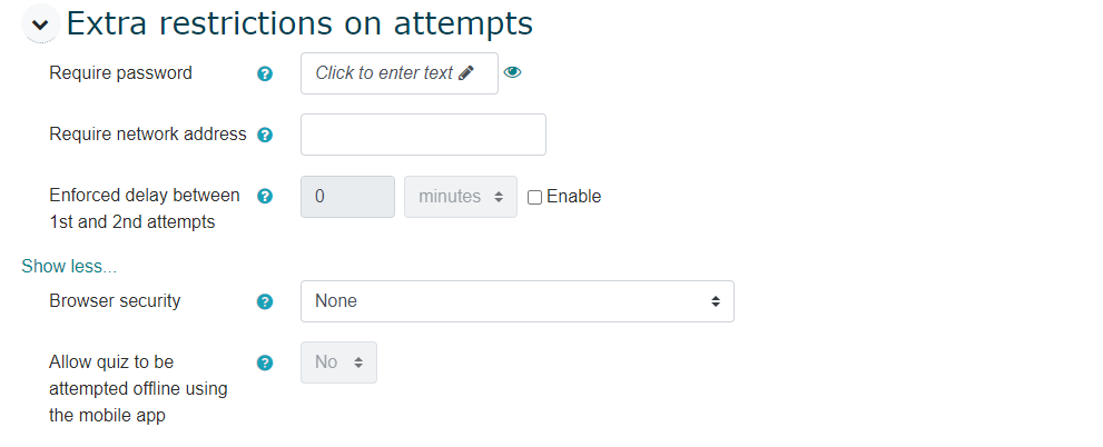 Require password: If you specify a password students must enter that password to attempt the quiz. Type the password to utilize this feature. To see the password, check the Unmask “eye”.