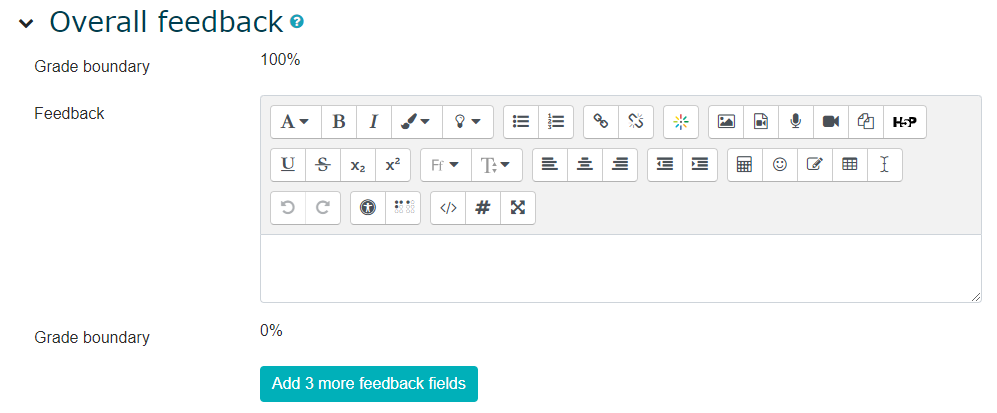Feedback boxes define the feedback for each grade boundary. To specify the feedback, enter your text.