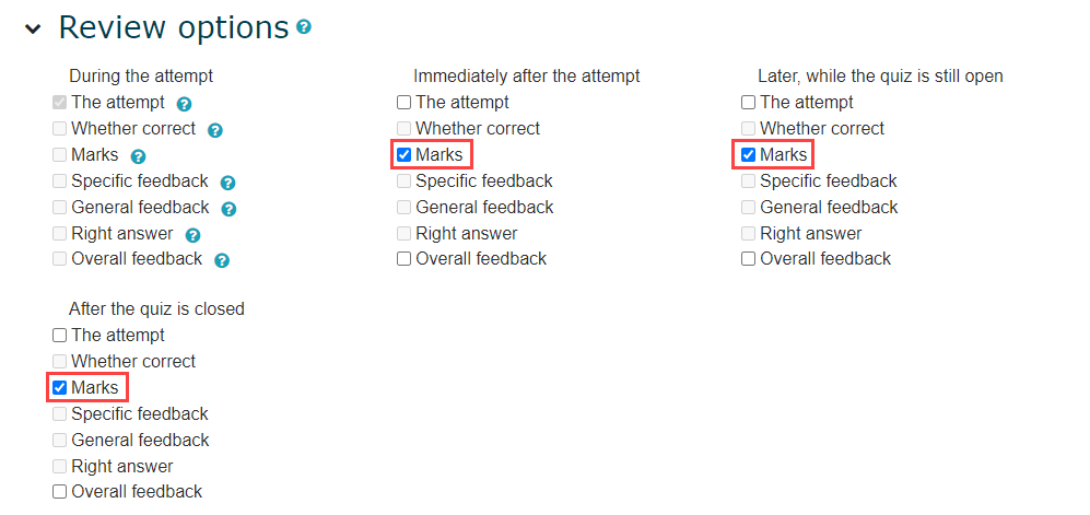 To do this, click on the quiz, then select the Settings tab. Next, under the Review options heading look at the sub sections (During the attempt, Immediately after the attempt, Later while the quiz is still open or After the quiz is closed) and check off the box next to “Marks” where you would like your students to be able view their marks in relation to this quiz. Most often the quiz has closed and “marks” is not checked in the After the quiz closed column!