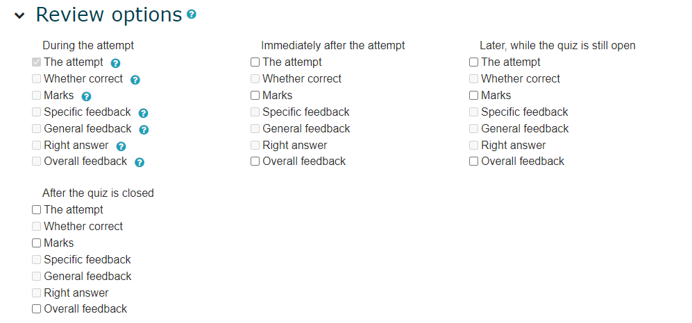 During the Attempt: options are only available when How questions behave (above) has been set to a mode that provides immediate feedback, in which case a checkbox will appear below each answer allowing the student to submit that response and then receive immediate feedback.