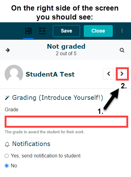 - On the left you should now see one students entire collection of forum postings (as well as responses) and on the right the students name and where to enter a grade. Enter the Grade on the right, and click the Next arrow (the black arrow pointing to the right) to view another students submission and mark.